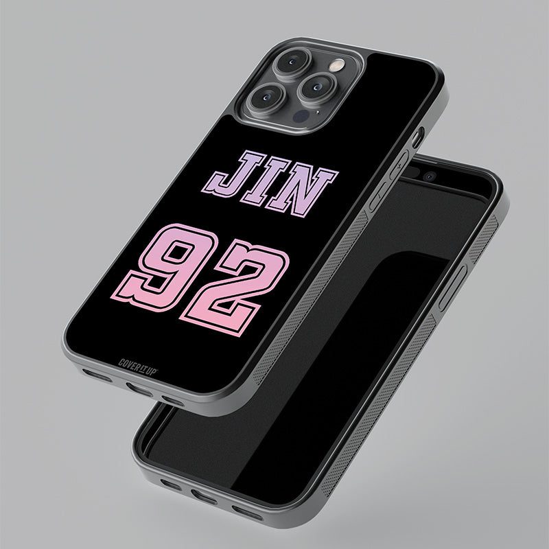 Nothing’s carved in stone. But your love for Jin & BTS can be carved on the back of your mobile phone with this new, fancy, black Jin Jersey Number Glass Case!